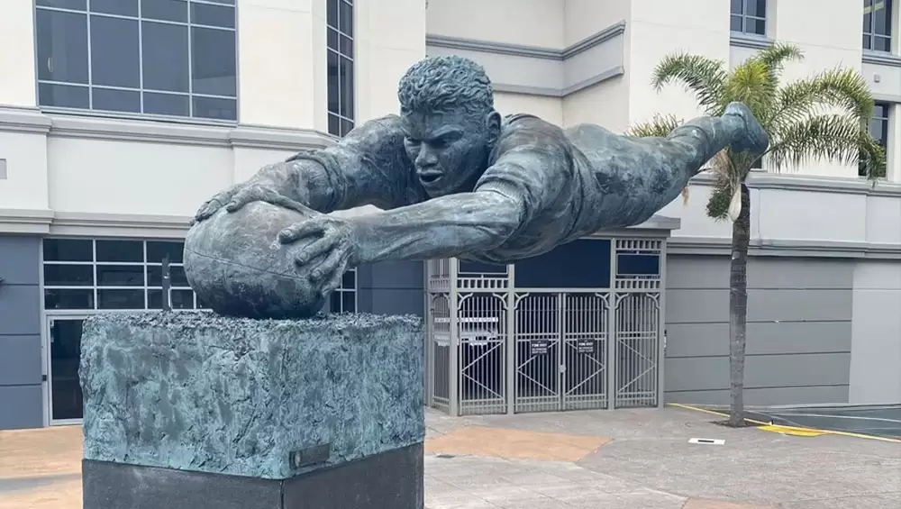 The statue holds a special place in the history of Eden Park and rugby in New Zealand. Created by Natalie Stamilla and based on the famous NZ Herald photograph taken by Geoff Dale, it was commissioned to commemorate Sir Michael Jones scoring the first try of the inaugural 1987 Rugby World Cup in his first game for the All Blacks.