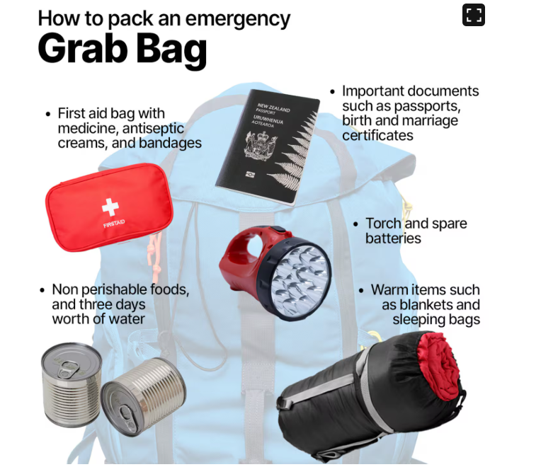 - Prepare an emergency grab bag with essentials: water, non‑perishable food, torch, batteries, phone charger, first‑aid kit, warm clothing, important documents and any required medication.