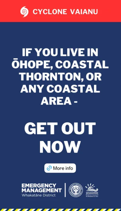- If you received an evacuation alert, follow it. A mobile alert for Whakatāne told residents to leave Ōhope, Coastal Thornton and other unsafe coastal locations before noon; those who did not evacuate have been told to shelter in place.